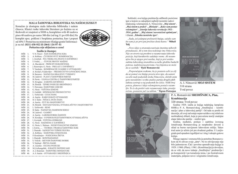NE PROPUSTITE JEDINSTVENU PRILIKU DA SE PRETPLATITE NA TEORETSKU BIBLIOTEKU.TAJNE OTVARANJA VRHUNSKIH TEORETICARA KONACNO I NA NASEM JEZIKU.KAKO IGRAJU I RAZUMEJU OVU PLEMENITU IGRU NAJBOLJI SVETSKI IGRACI, TOREADORI TURNIRSKIH ARENA ??
